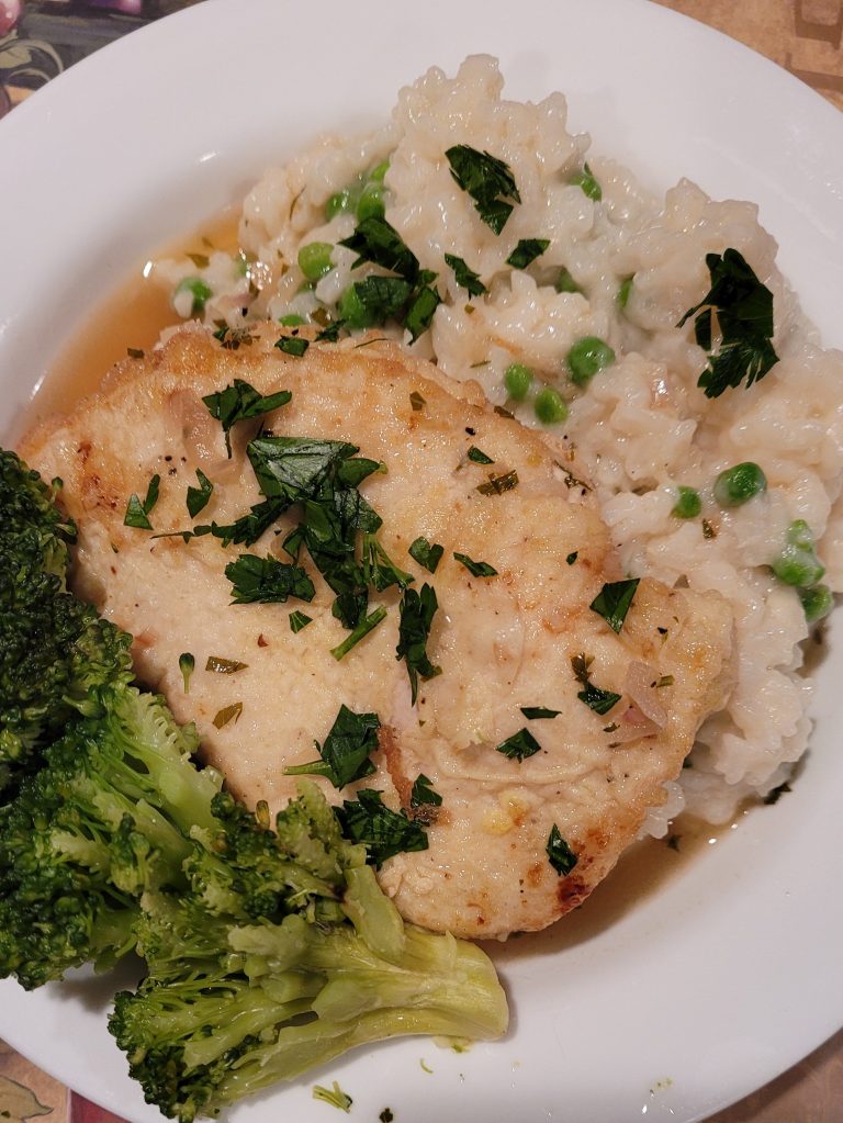 The rice I use is Rice Select Arborio Rice. It’s the only rice I’ve used, and it’s worked out for me. I may experiment with other Arborio Rice brands, but that will have to be later. As for the wine you use, you can use any dry white wine. I used Seastone Vinho Verde. This is available at any Total Wine & More! It’s a nice wine to enjoy too, just in case if you need a drink while cooking. If you use this wine as well, don’t be alarmed when it looks like it’s fizzing. It is a frizzante wine (a bit of bubble to it). As for broth, any chicken broth works! You can even substitute for vegetable broth or beef broth. The beef broth definitely gives it an amazing flavor. It gives it a more robust flavor, as if it was boiled with beef bones. Make sure you simmer the broth in a separate pot before adding it to the risotto. Heating the broth before adding it to the risotto rice is going to produce the same creamy, dreamy texture. It’s a comfort food and without simmering the broth first, the arborio rice won’t release it’s starch and it won’t be creamy.