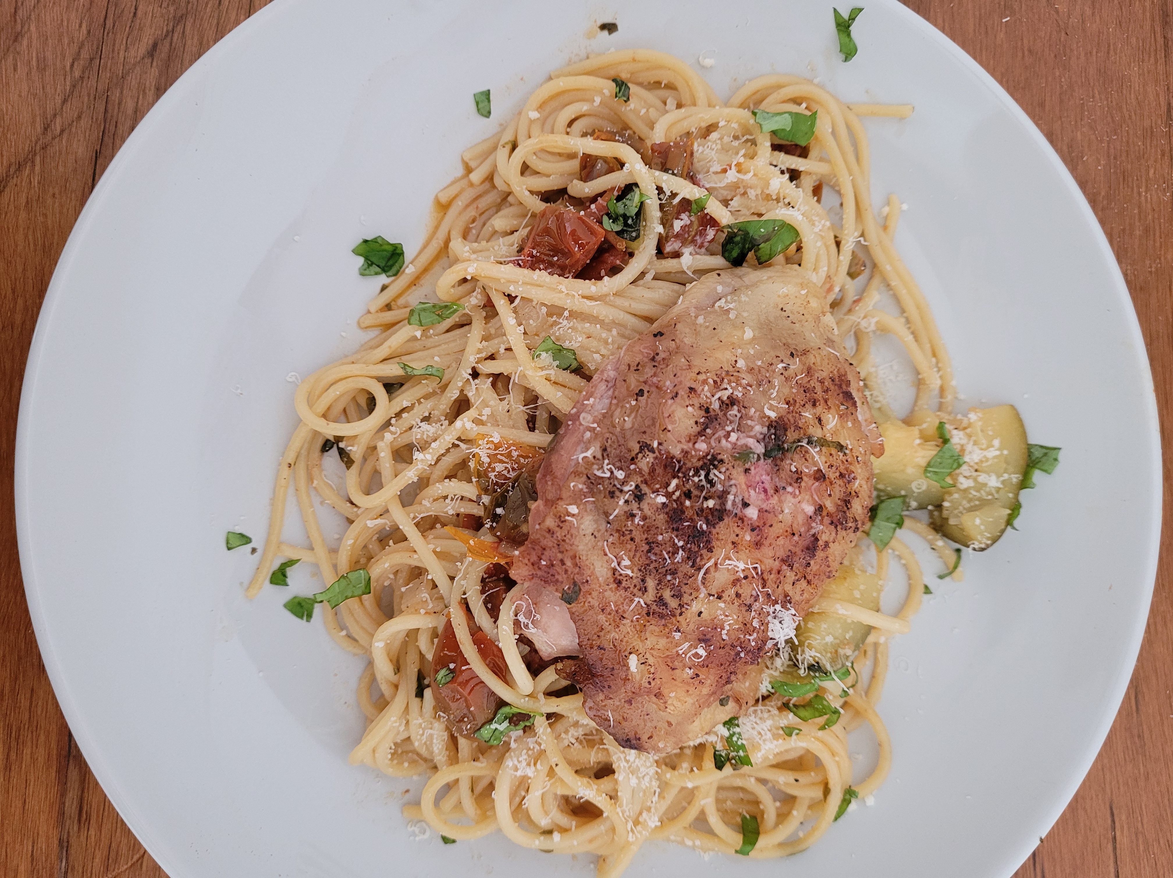 One-Pot Burst Tomato and Zucchini Spaghetti with Chicken Thighs