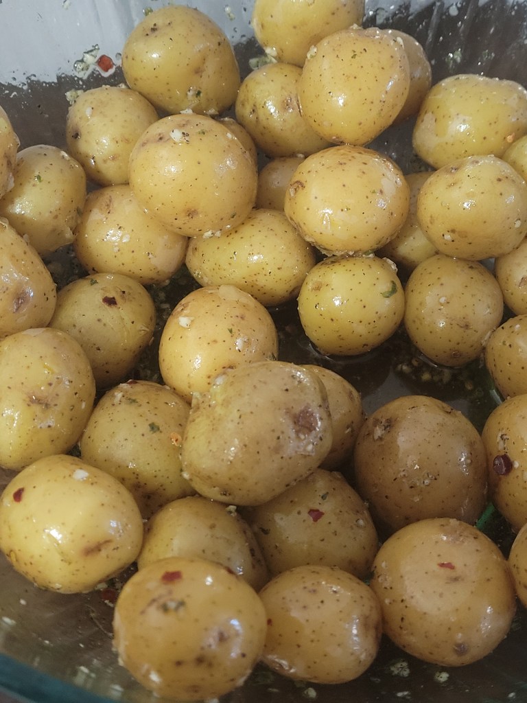 These potatoes are so easy to make. You boil the baby potatoes and drain them like you would if you were making mashed potatoes, this would be the first step. The potatoes have to be tender so that a fork can be inserted into the potato with little to no resistance. Dressed in a garlic-oil mixture, these potatoes are then smashed with the bottom of a glass cup, then roasted to perfection. A bit of crunch with the softness of the potato, like a French fry! The garlic gives it that bite and the parmesan cheese gives it a bit of a nutty note. A beautiful combination of a potato.