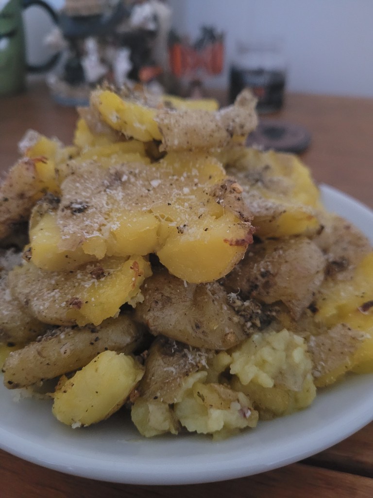 Not mashed potatoes, but SMASHED potatoes! It’s like a roasted potato but smashed. This potato was created out of inspiration that was given to me on Facebook. There was a video that I caught a snippet showing little baby potatoes being smashed with the bottom of a glass cup. I thought to myself, “maybe I can make something like this.” So, I made garlic parmesan smashed potatoes. This was paired with Bacon Wrapped Jalapeno Meatloaf (recipe coming soon!).