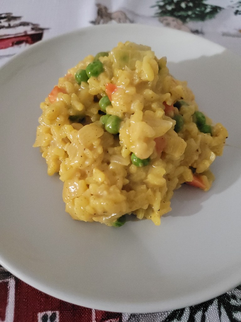 Risotto alla Milanese is one of the most popular risotto dishes. Creamy and tasty, saffron risotto is made with rice, saffron, butter, meat stock, dry white wine, and Parmigiano cheese. I added garlic and onions to give the dish more flavor. To give this dish its color, I soaked some saffron in hot water for 5 minutes. It colors the water and gives more of the taste you want in this dish. The smell is absolutely pleasant too! You can omit the carrots and just add peas if you wish. I had leftover frozen peas and carrots so that’s what I used.