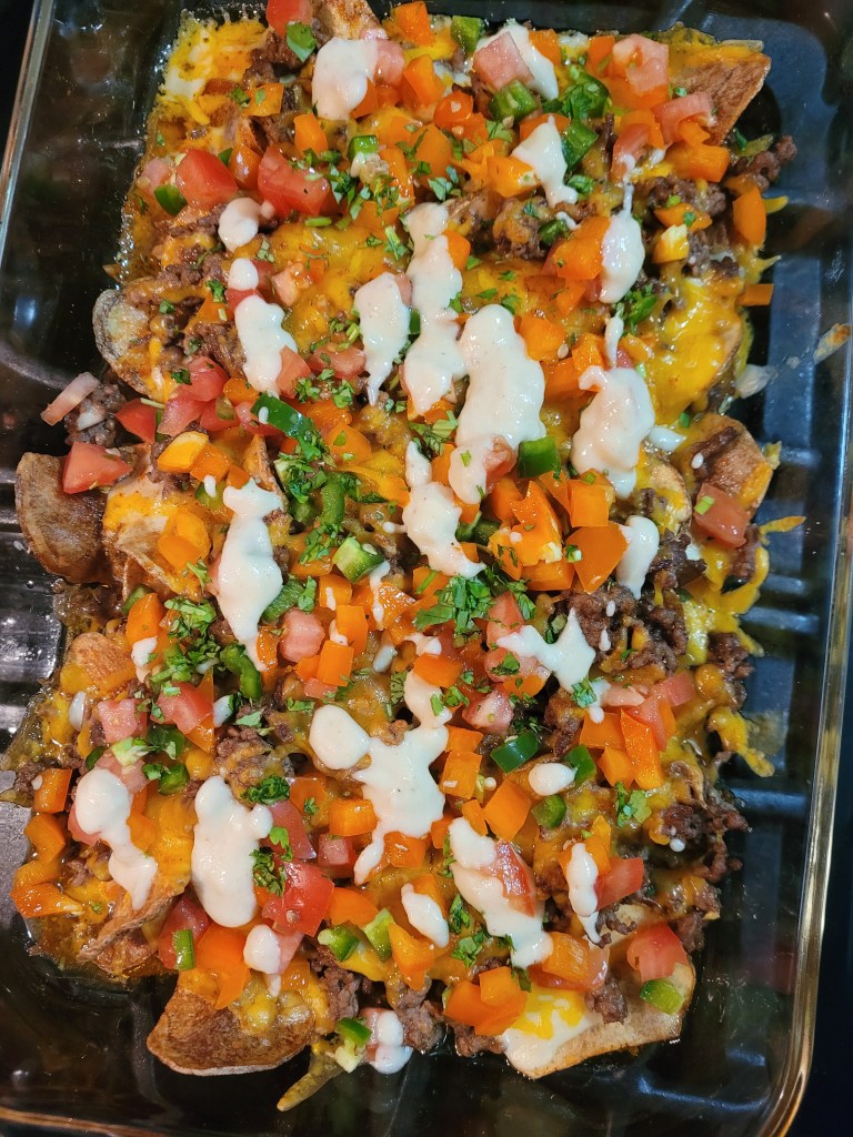 Baking this beauty only takes about 10 minutes so the shredded cheese fully melts. The secret to amazing nachos is layering them like a lasagna. I did two layers. I feel that if the nachos are one layer, there isn’t much to it. If you choose to make the chips and cheese sauce from scratch, it’ll take you about 30 minutes extra. However, it is totally your choice to use bagged chips and store-bought nacho sauce.