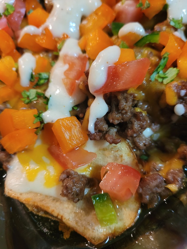 - Remove the hot pan from the oven and drizzle with nacho cheese. Sprinkle the remaining taco seasoning. Top with the jalapenos, tomatoes, orange bell pepper, and garnish with cilantro. Serve immediately. Enjoy!