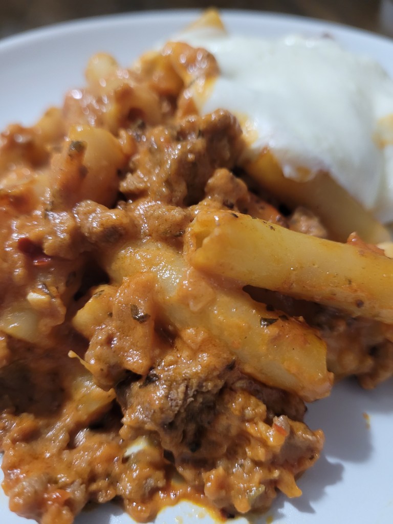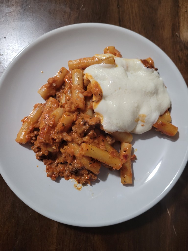 This dish could easily be made vegetarian style by leaving the meat out. If you prefer, you can also use sausage or turkey instead of the ground beef. It just gives the sauce a slightly different flavor. If you don’t have ziti (or can’t find it for some reason), you can use penne or rigatoni! Keep in mind that penne is smaller, and rigatoni is fatter, so adjust your baking dish size accordingly.
