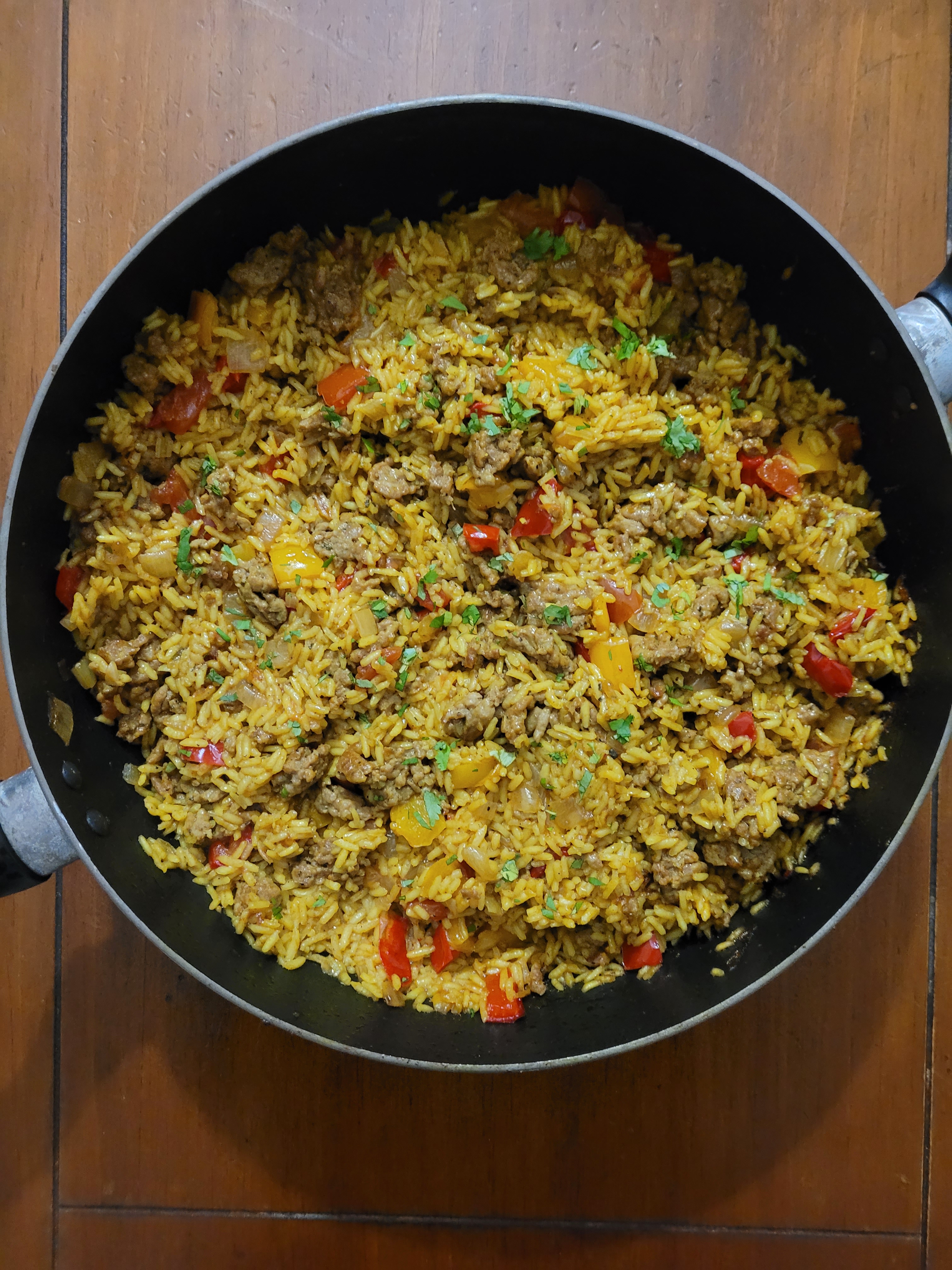 All you need for this dish is one large skillet, ground sausage, peppers, onions, long-grain white rice, chicken broth, and a lot of spices!