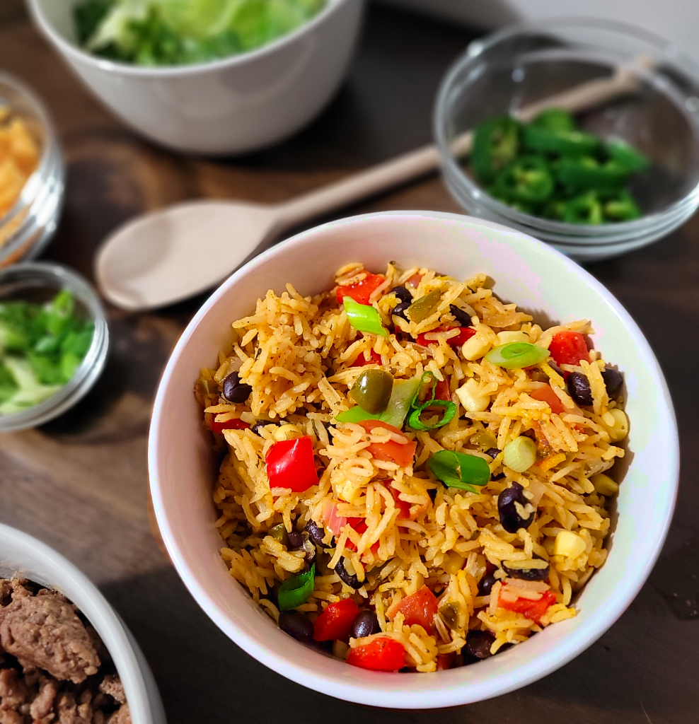 A flavorful Mexican-inspired dish perfect for any taco night! Rice that has been boiled with saffron for color and aroma, complete with colorful veggies and spices. Serve with taco beef, sour cream, and salsa for the perfect burrito bowl or taco!