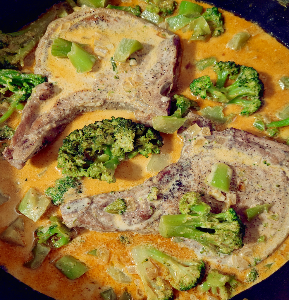 Always season the meat before you cook it! In a large skillet, melt the butter and sear the pork chops so they get a nice brown color. Set them aside. Add the onions to the skillet to pick up the extra browned bits, then add the garlic once the onion has softened. Deglaze the pan with the chicken broth, add the chops back with the bay leaves and simmer for 30-35 minutes, or until the temperature of the pork reaches 145F. Remove the chops from the pan again and cover loosely with foil. Bring the pan juices to a boil and let it reduce by half on high heat; skim off any fat that is there. Remove the bay leaves, then turn the heat to low. Stir in the heavy cream, cajun seasoning, and smoked paprika. Add the broccoli, and simmer for 3 minutes to allow the broccoli to defrost. Don’t let it boil. Add the chops back and smother with the sauce. Serve over egg noodles, grits, or a baked potato.