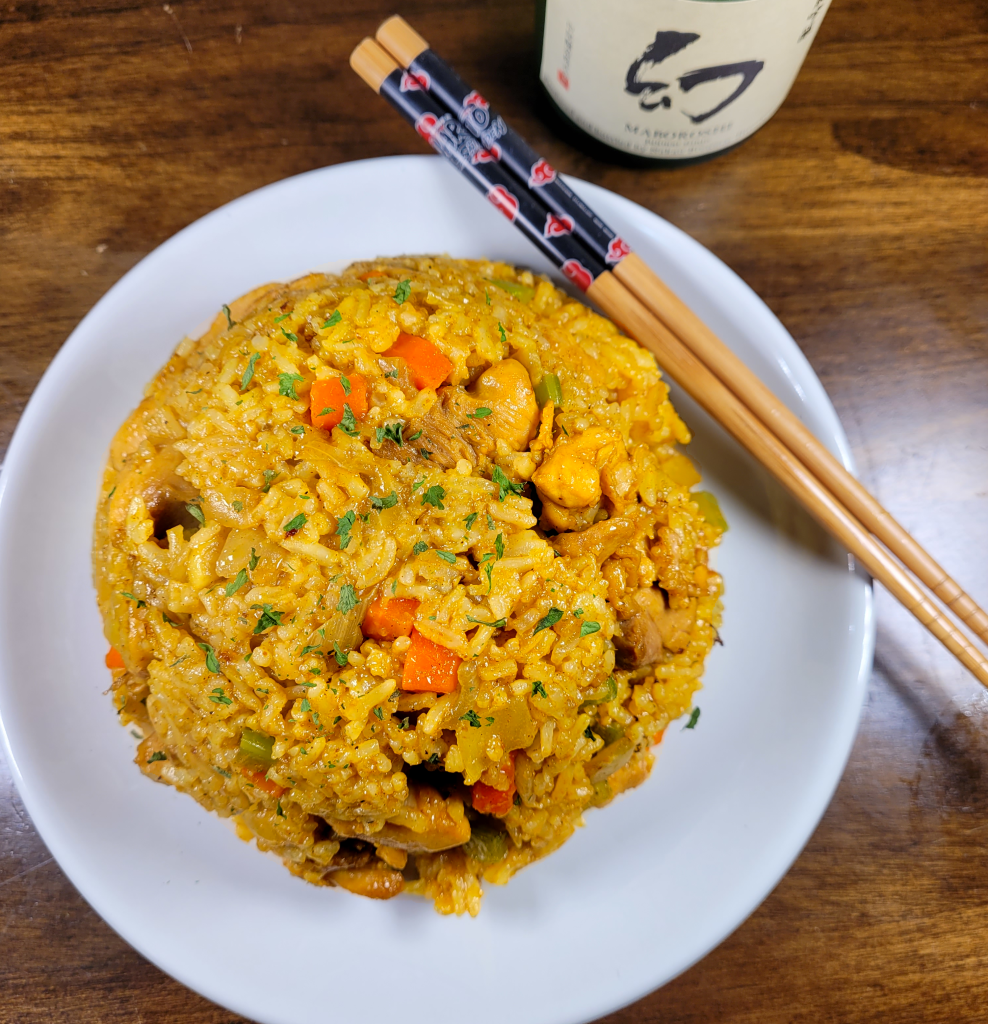 In a wok, heat the butter and oil on high heat. Add the chicken and cook. stirring constantly, for 5 minutes until the chicken is white and no longer pink. Add the onion, carrot, celery, and garlic. Cook, stirring constantly, for 2 minutes, until the veggies soften. Add the curry powder and cook, stirring constantly, for 30 seconds. You want to toast the curry and make sure it doesn’t burn! Add the sake and cook for 30 seconds, stirring constantly. Add the rice. Break up the lumps of rice and stir constantly. Add the soy sauce, Worcestershire sauce, salt, and pepper and cook for 30 seconds more, stirring constantly. Turn off the heat and plate, sprinkling with the parsley.