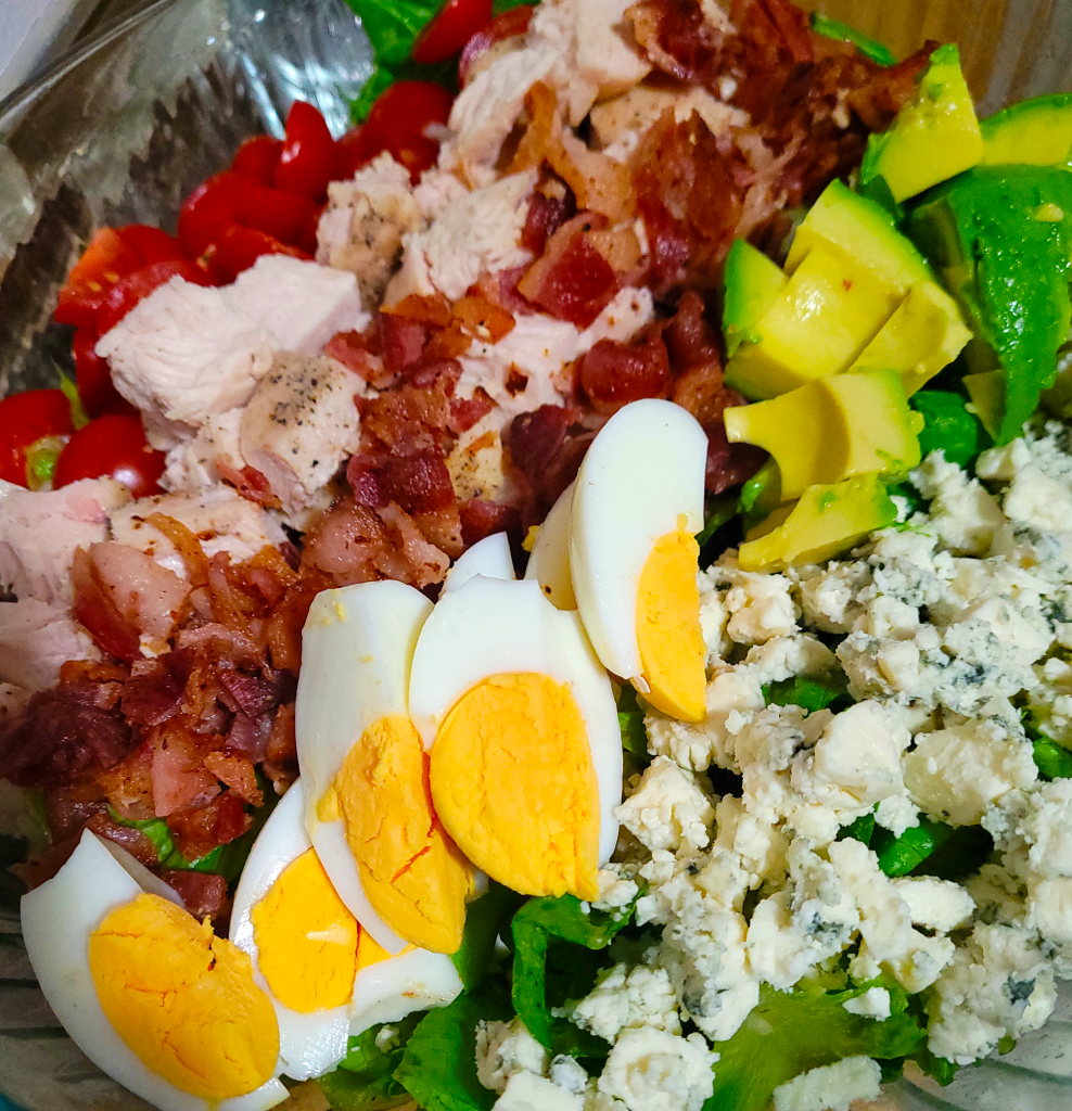 - On a platter or large mixing bowl, spread out the lettuce evenly. Add rows of hard-boiled egg, chicken, bacon, avocado, blue cheese, and cherry tomatoes.