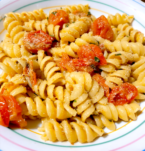 - Toss the tomatoes with the pasta, reserved pasta water, and 1 tbsp parmesan cheese. Serve with the remaining breadcrumbs garnished on top and drizzle with olive oil.