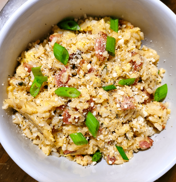 Cook the bacon in a skillet until crispy. Remove the bacon from the pan and set aside. Reserving the bacon fat, cook the onions until softened and tender. Add in the garlic and cook for a few seconds or until aromatic. Add the rice, breaking up any large chunks of rice. Cook until the rice slightly crisps up and most of the moisture has cooked out. In a mixing bowl, whisk together the egg yolks, whole eggs, and parmesan together. Season with salt and pepper to your liking. Keep in mind that the cheese is already salty, so salt with caution! Pour the egg mixture into the rice, stirring as you pour. Toss in the bacon. Serve with the scallions on top and extra parmesan, if desired.
