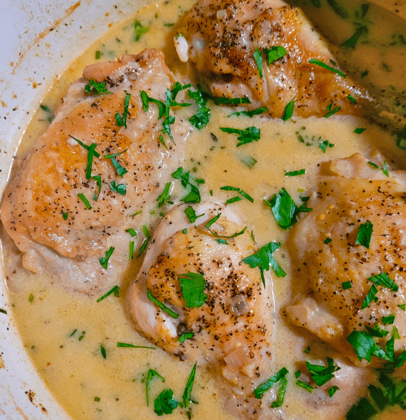 Juicy chicken braised in a rich, tangy sauce flavored with Dijon mustard. A slight variation of a classic French dish, this recipe is perfect for a romantic dinner with your loved one or on a weekend with friends. Serve this over egg noodles, rice, or potatoes with a side of your favorite veggie.