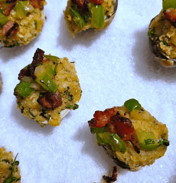 This recipe is for garlic lovers. Herbaceous and garlicky breadcrumb stuffing on top of freshly baked clams is always a yes please from me. There is enough bacon to amp up the savory factor, but not so much that it overwhelms the flavor of the clams themselves.