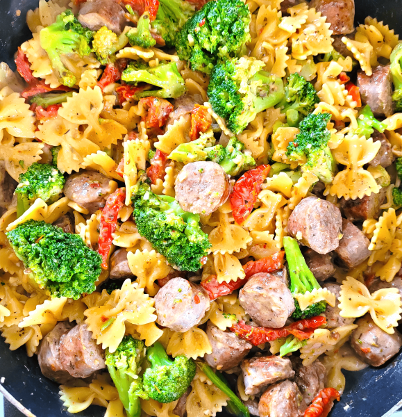 One Pot Sausage, Sun-dried Tomato & Broccoli Garlic Pasta