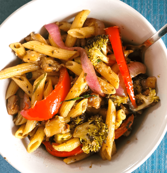 The keyword for this recipe: simple. It’s so easy to prep and make. You can use almost any veggies or greens here in this recipe! If you choose to add spinach or another leafy green, then I would recommend adding them in when you toss the veggies with the pasta.